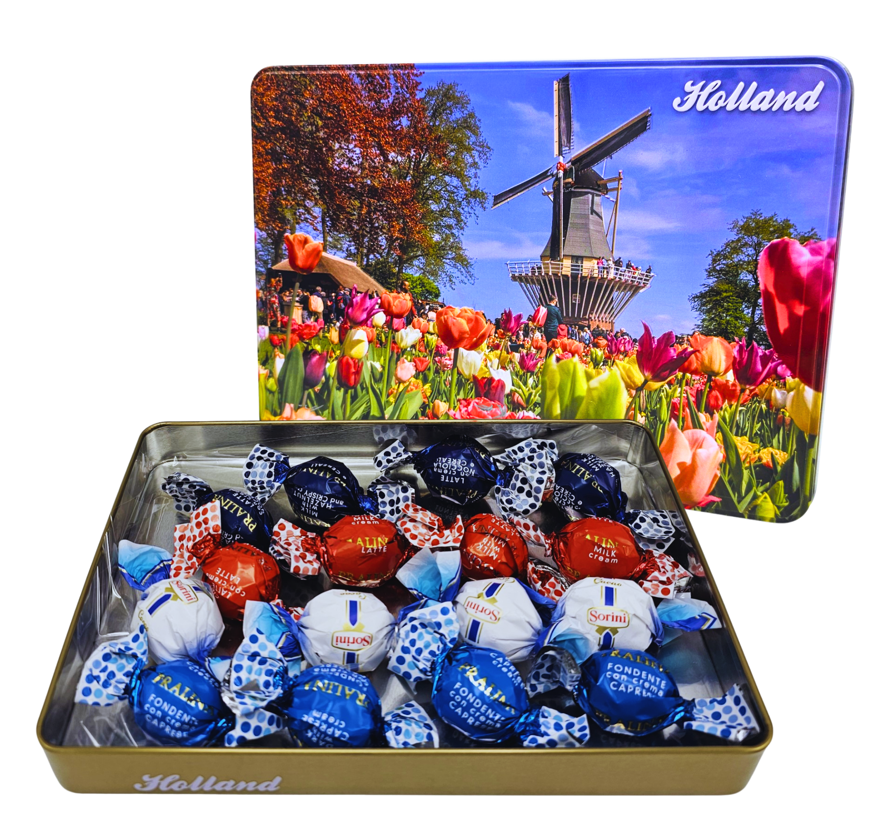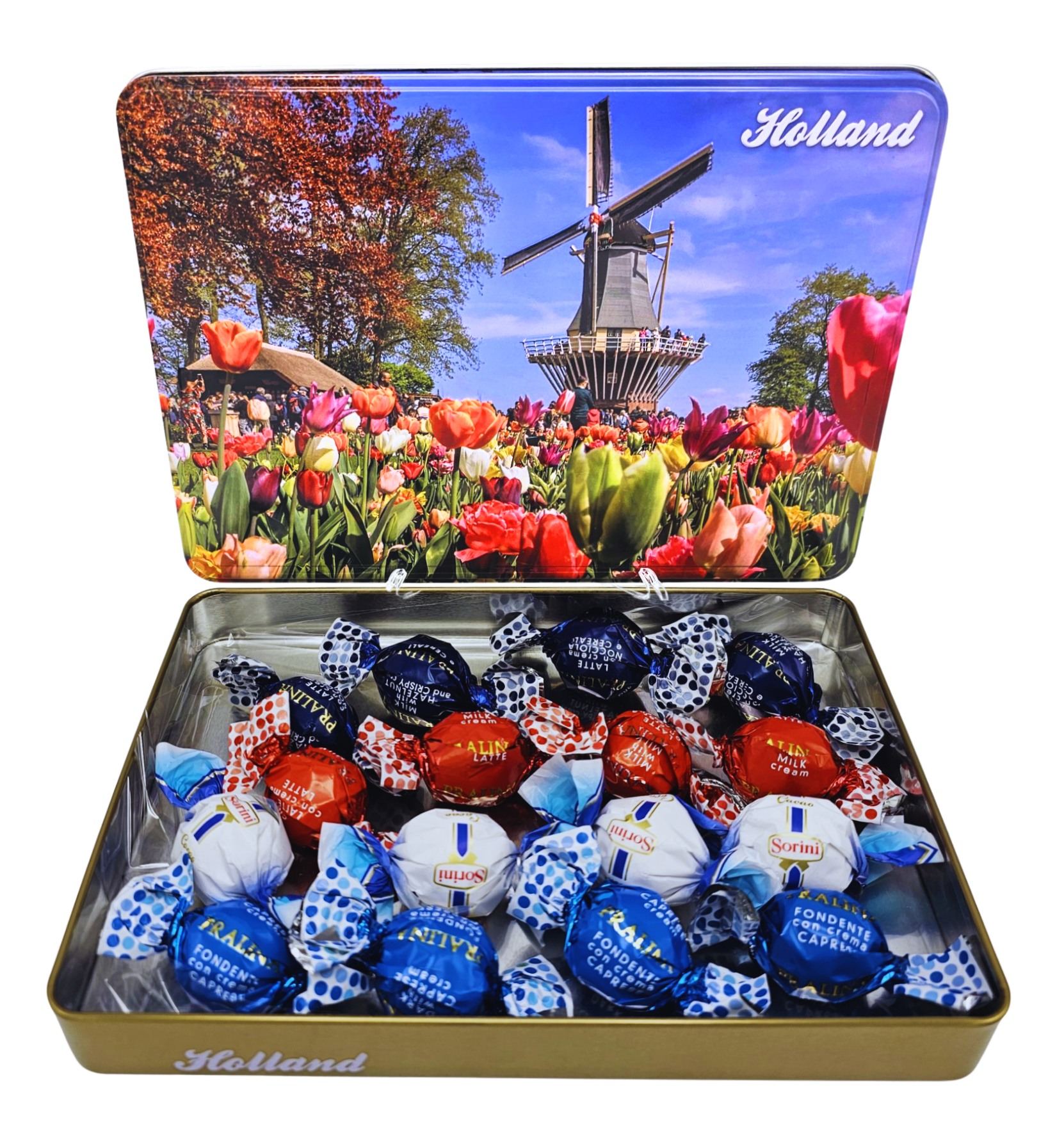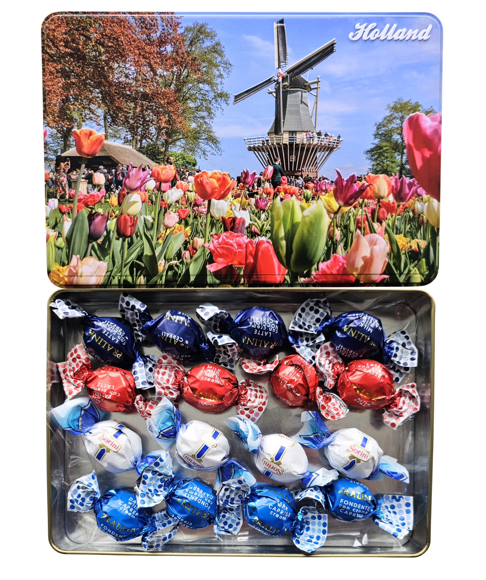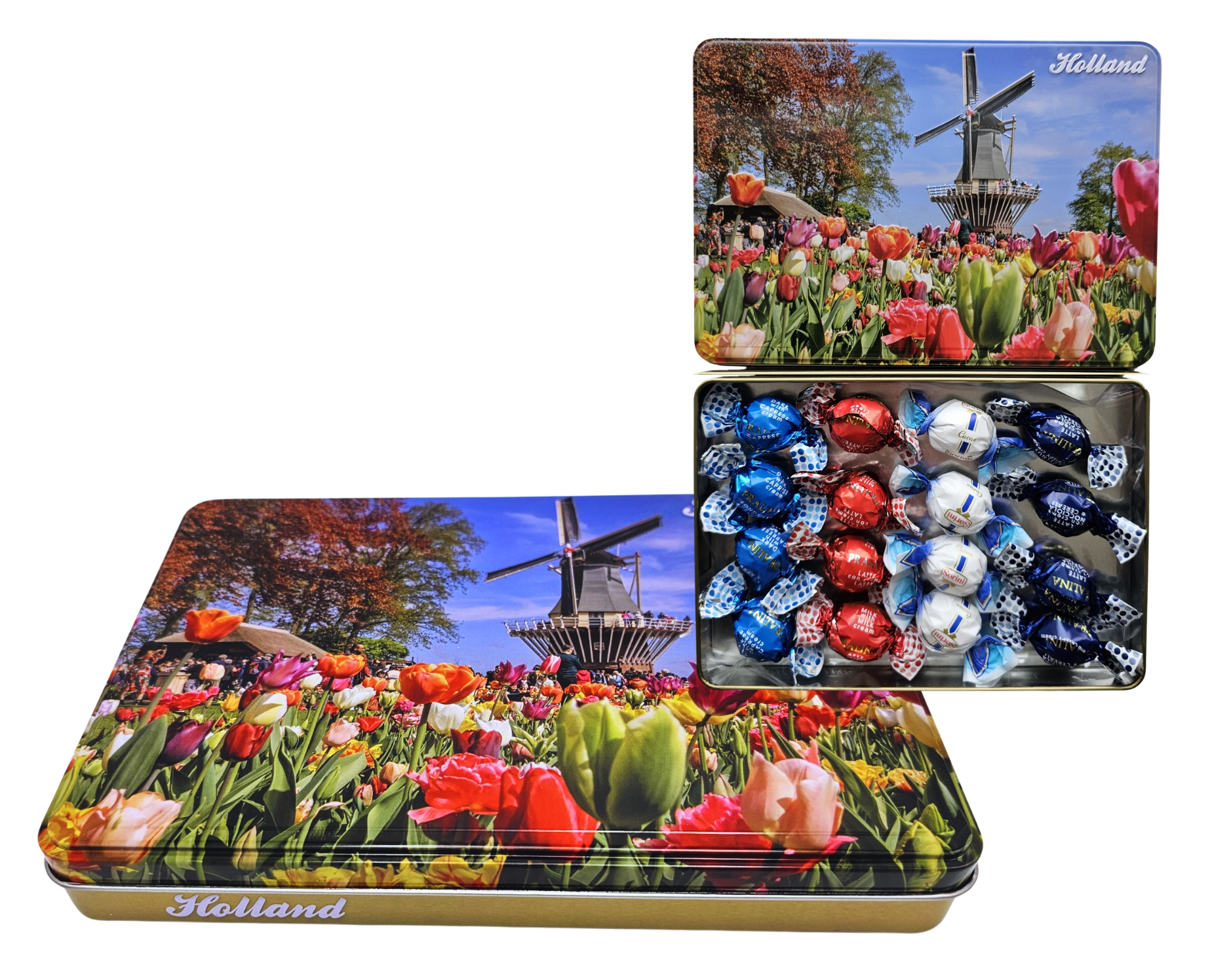 Diese fröhliche Souvenirdose mit bunten Tulpen und Windmühlen ist gefüllt mit köstlichen Schokoladenkugeln in vier verschiedenen Geschmacksrichtungen.