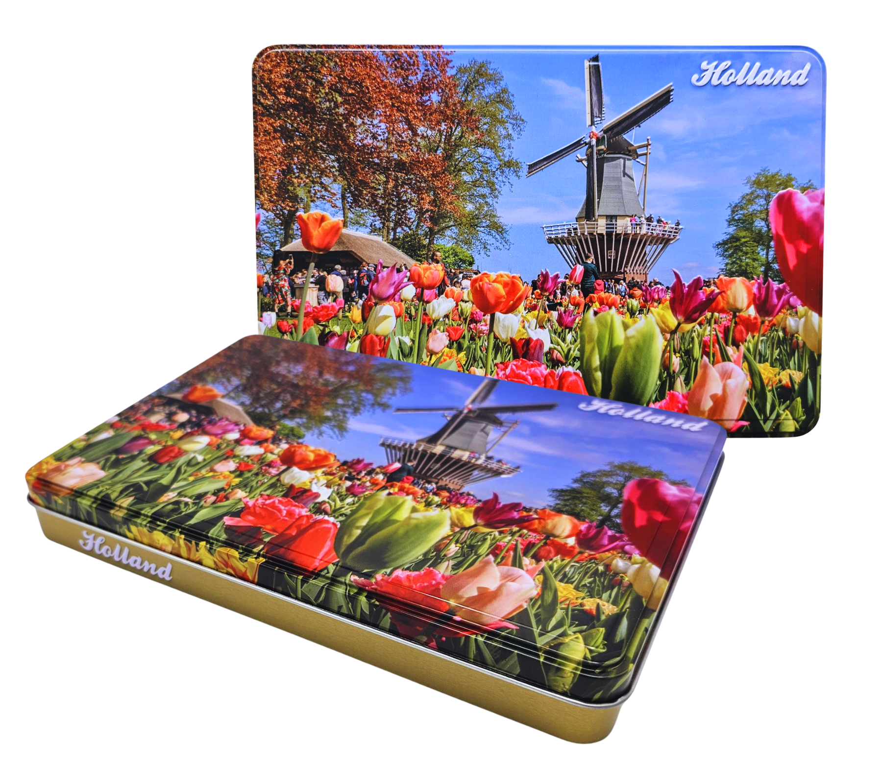 Die flache Metalldose ist vollfarbig gestaltet und strahlt pure holländische Gemütlichkeit aus.