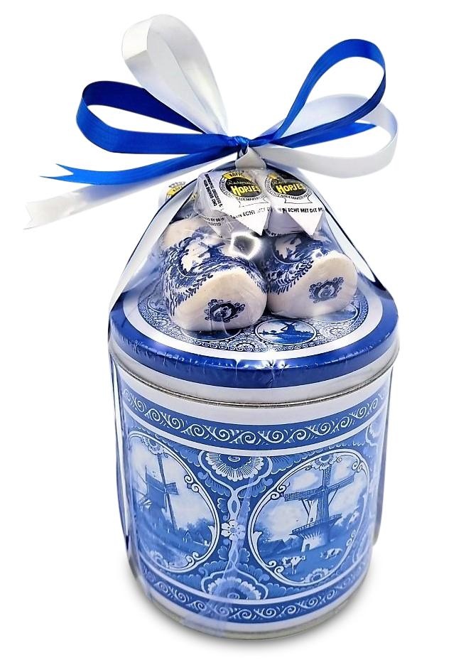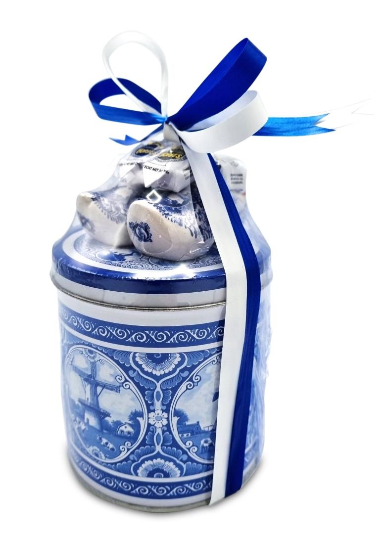 Stroopwafels aus der Dose – mit Clog und Hopfen (Delfter Blau) Gefüllt mit köstlichen Stroopwafels. Die Dose wird vakuumversiegelt geliefert und ist mit einem weißen und blauen Band verziert.