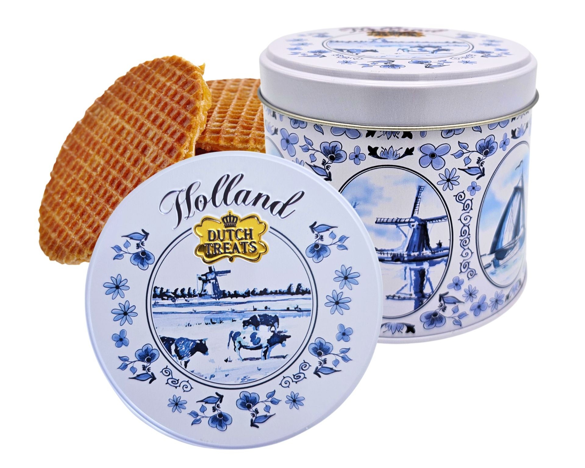 Authentisch gebackene Sirupwaffeln in einer schönen Aufbewahrungsdose, zusammen mit einer hübschen Kaffee- oder Teetasse als Geschenkset verpackt.