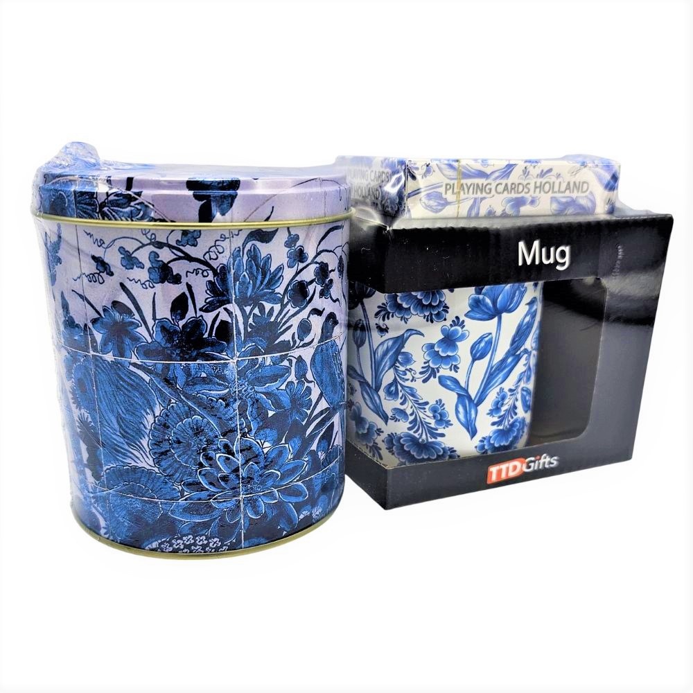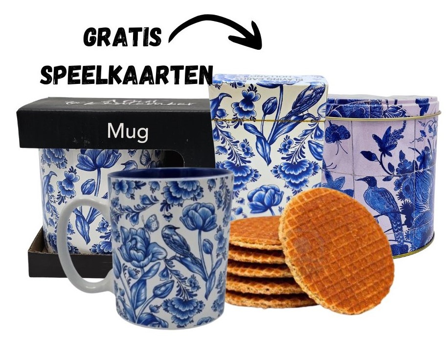 Stroopwafels in einer Dose und einem Becher mit KOSTENLOSEN Spielkarten. Becher und Dose mit dem gleichen Delfter Blau-Design. 8 frische Stroopwafels in einem verschließbaren Beutel