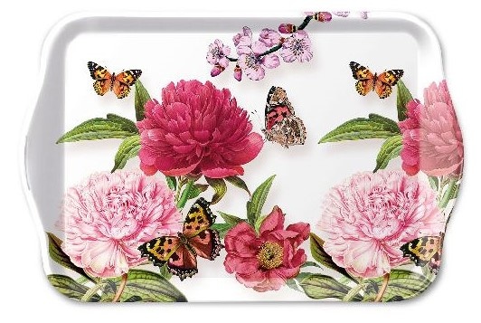 Ein kleines Tablett mit einer Pfingstrosenranke darüber.
