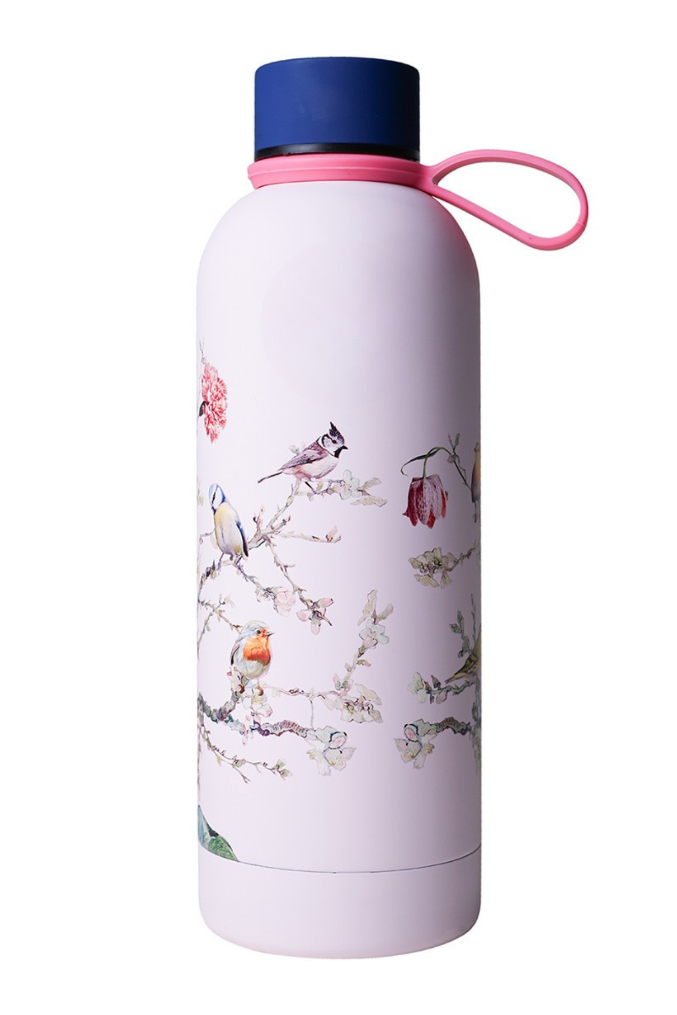 Eine Thermosflasche mit einem Dekor aus bunten Waldvögeln auf einem Ast.