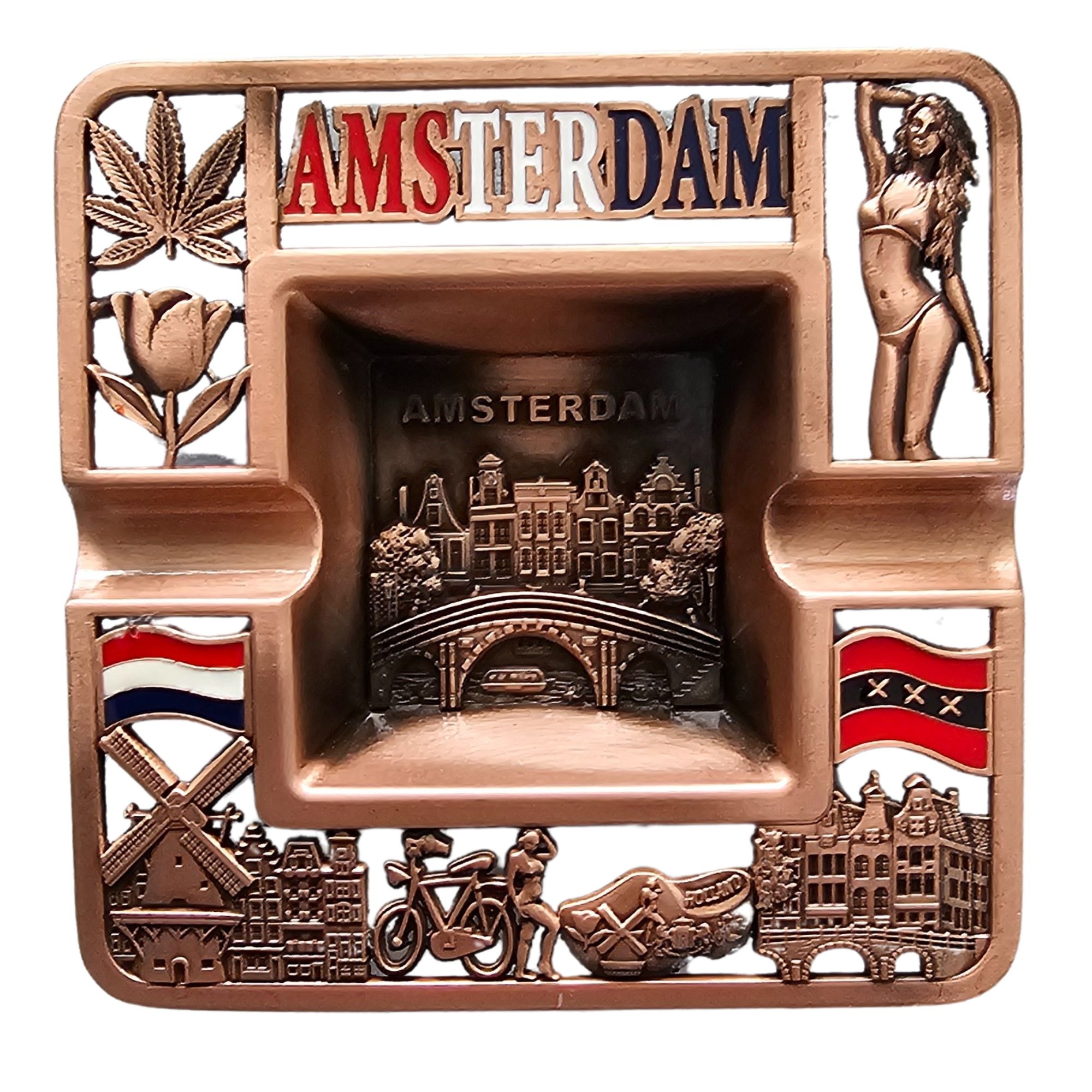 Ein wunderschön gestalteter Aschenbecher mit lasergeschnittenen Symbolen und einem wunderschönen Bild von Amsterdam,