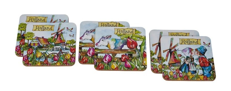 Das Set aus diesen 6 Untersetzern ist mit einem farbenfrohen holländischen Aufdruck versehen