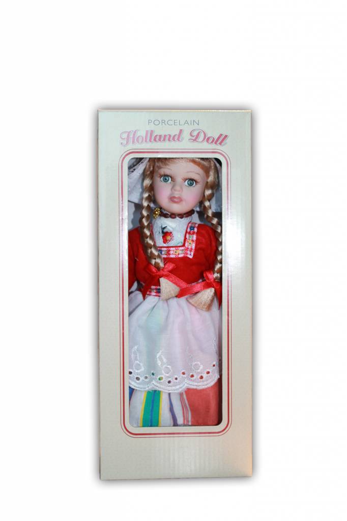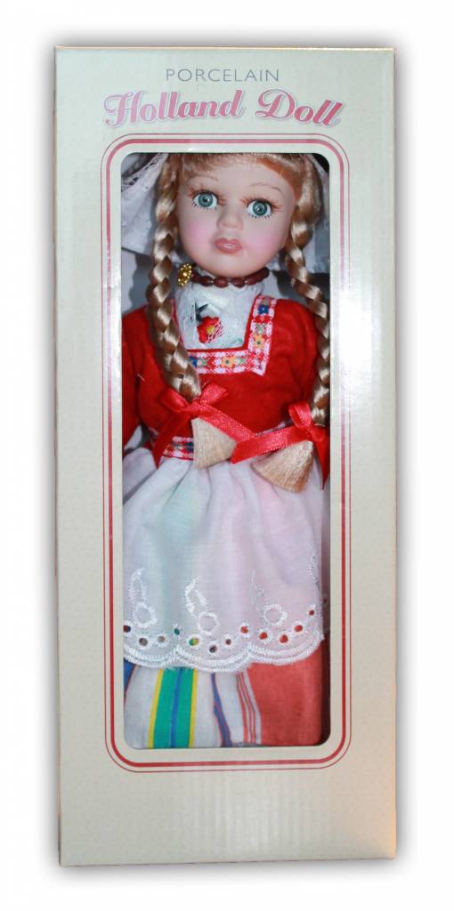 Wunderschöne Porzellanpuppe mit stylischen Zöpfen in traditioneller niederländischer Kleidung.