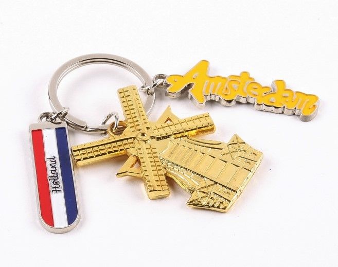 Amsterdam (Mill) Schlüssel drei Charms Schlüsselring • Farbige Beschriftung Amsterdam Molen • 5 cm • Dutch Flag • Gold • Größe 7 cm