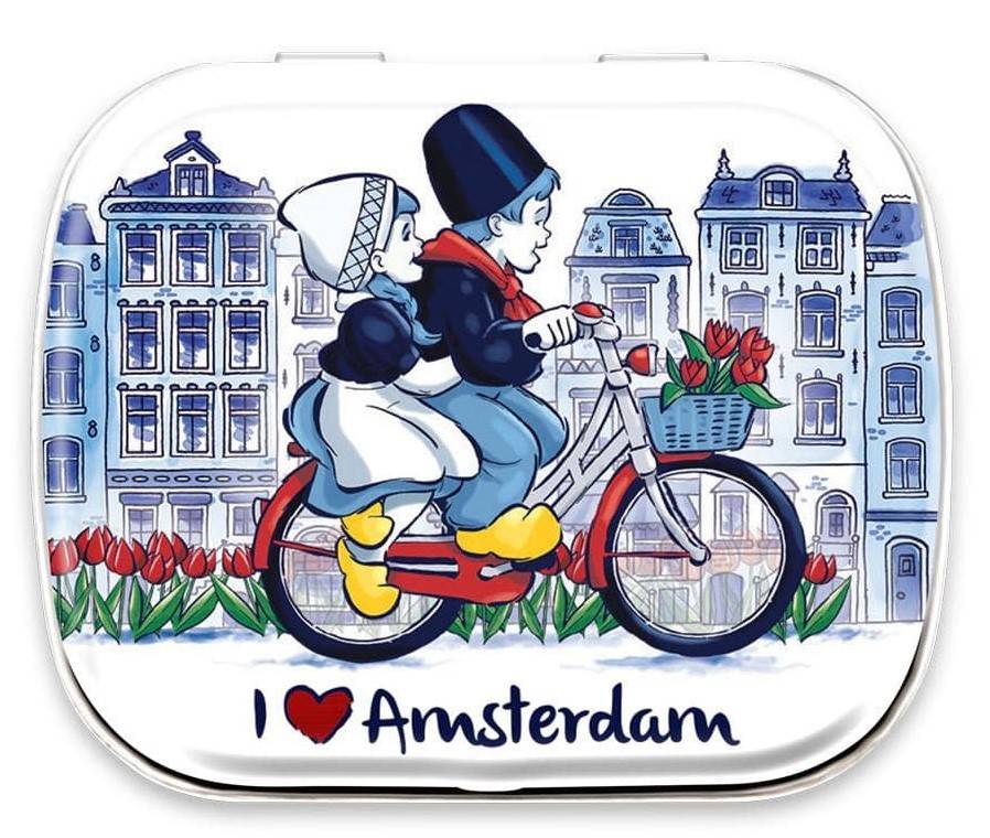 Metalldose mit Mini-Pfefferminz Bild: Holländisches Paar auf Fahrrad in Amsterdam Größe: 6. x 4 cm Inhalt: 14 Gramm Pfefferminz ohne Zucker Eine super originelle Dose, die man natürlich einfach nachfüllen oder vielleicht...