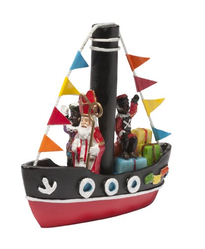 Das Boot von Sinterklaas ist fröhlich mit Fahnen geschmückt.