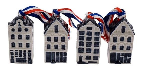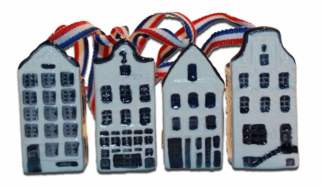 Delfter blaue Giebelhäuser. Set mit 4 Giebelhäusern. Ausgestattet mit rotem, weißem, blauem Band. Ein Hingucker für Ihren holländischen Weihnachtsbaum Größe: 2,5 x 2,5 x 5,5 cm • Verpackt pro 4 Stück • In transparenter Geschenkbox • Handbemalt • Holländis