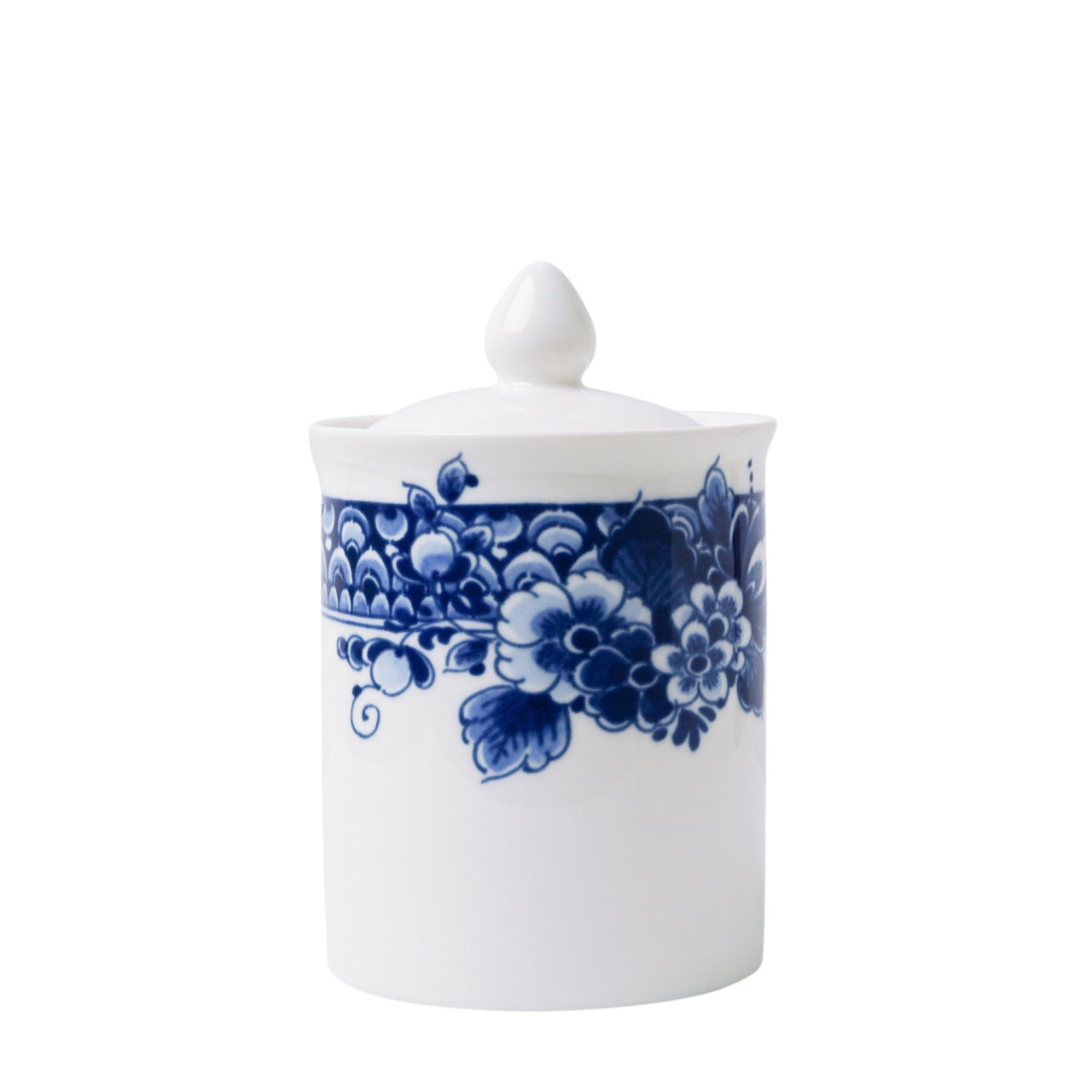 Ein wunderschönes Vorratsglas aus Porzellan, verziert mit Pfauenaugen und einem Blumenmuster.