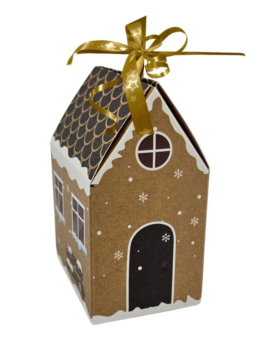Dieses Weihnachtshäuschen ist aus Kraftkarton gefertigt und mit einem eleganten, goldfarbenen Aufhängeband versehen.