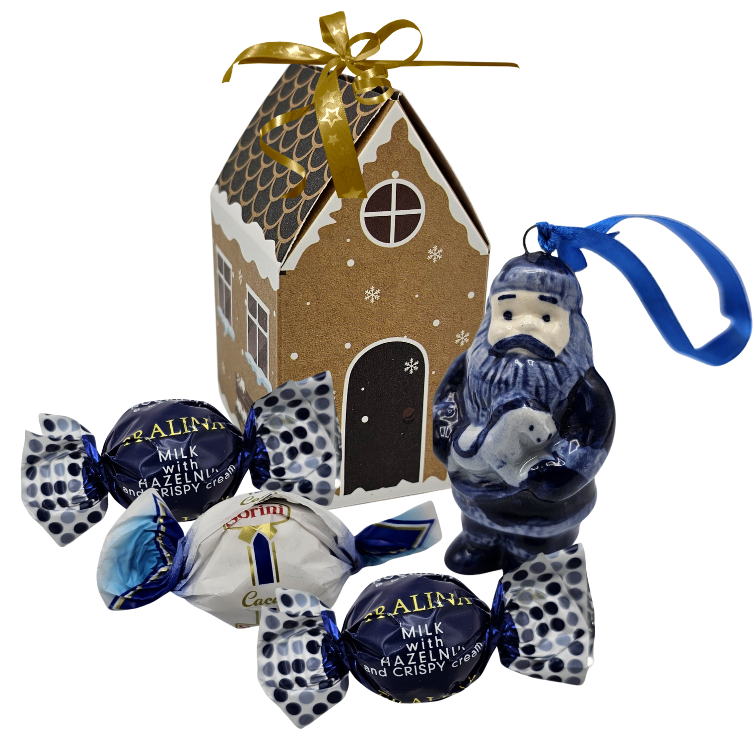 Das Haus ist gefüllt mit vier großen Schokoladenkugeln aus cremiger Milchschokolade in drei köstlichen Geschmacksrichtungen: Fondant, Crema und Praline .