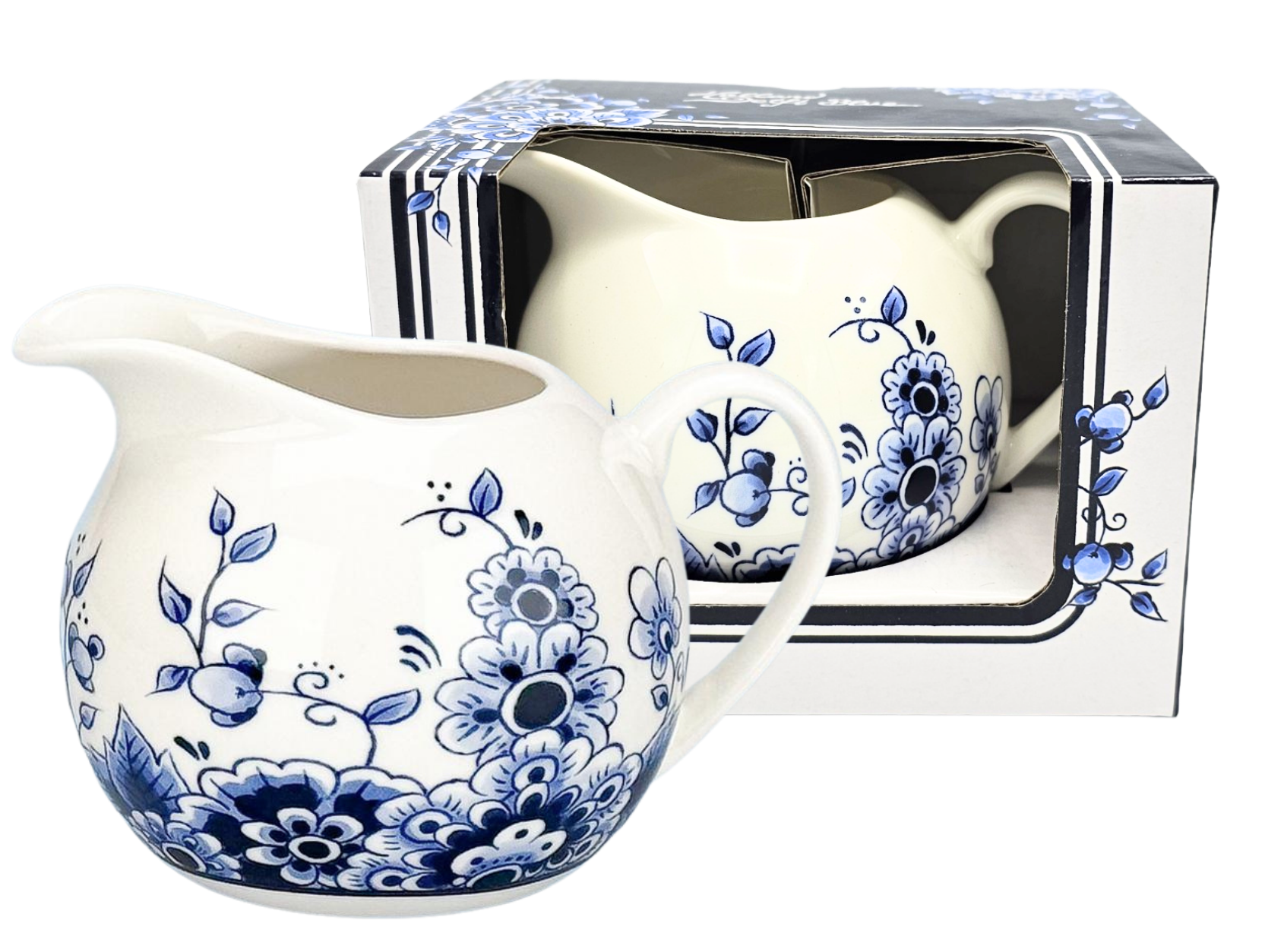 Dieser Milchkrug in Delfter Blau ist mit einem klassischen Blumenmuster verziert und vereint Eleganz mit Funktionalität.