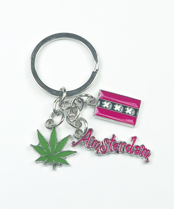 Funny key ring for weed lovers. A set with the weed leaf-Amsterdam label and the Amsterdam flag. Made in silver color