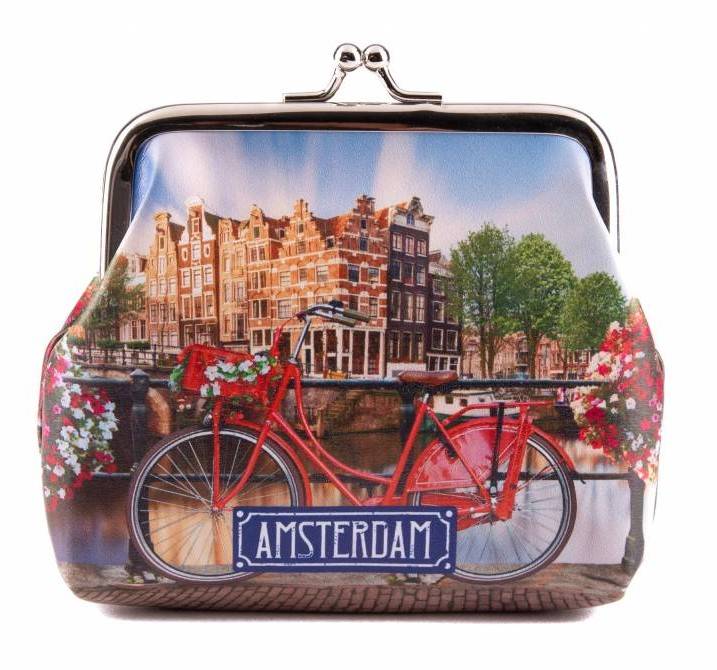 Buy a wallet from Typically Dutch? This is fun, with a bicycle on the bridge in Amsterdam.