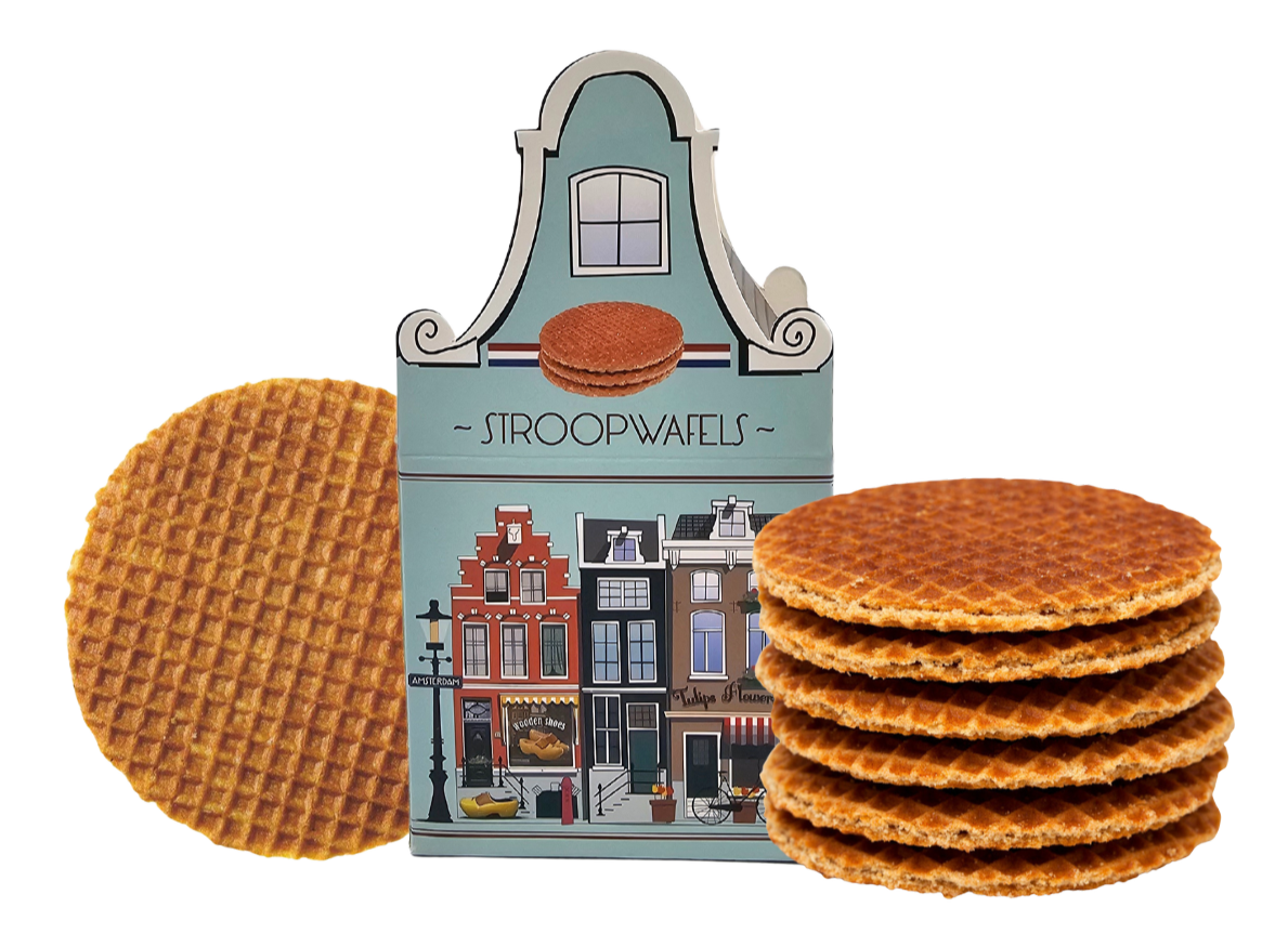 The set includes a generous Amsterdam mug, perfect for a generous cup of coffee or tea. It also comes with delicious stroopwafels in cheerful packaging that can easily be transformed into a charming canal house.