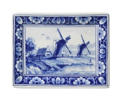 Applique canal house rectangle. Mill landscape on this beautiful Delft blue appilque. Can be used as a serving bowl, but also incredibly beautiful to hang on the wall.