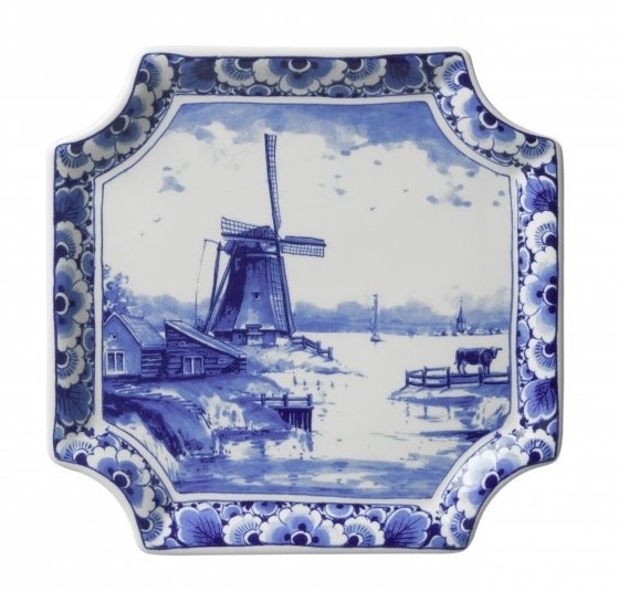 Wandbord-Delft Blue-Square Mill An applique with a traditional Dutch mill landscape. Nice image, a windmill near a water landscape. An eye catcher on the wall on the wall. Naturally, it is also ideal as a serving dish. Dimensions: 18.5 x 18.5 cm. Weight: