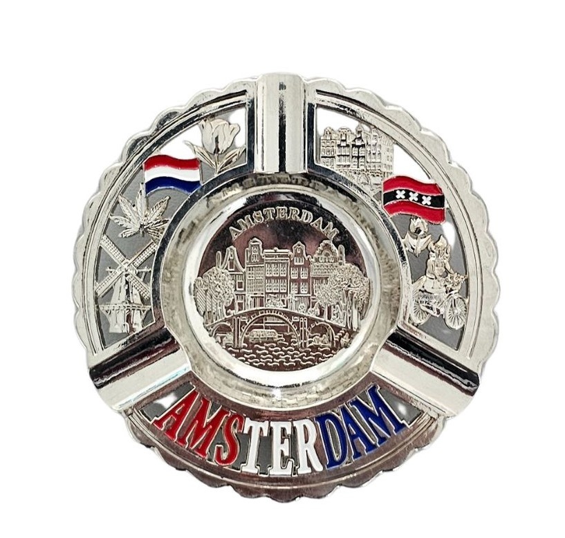 This ashtray has a round shape and is decorated with icons of Holland and Amsterdam. It is made of shiny silver and has a high decorative value - almost too beautiful to use. The size is 14 cm and it is delivered quickly.