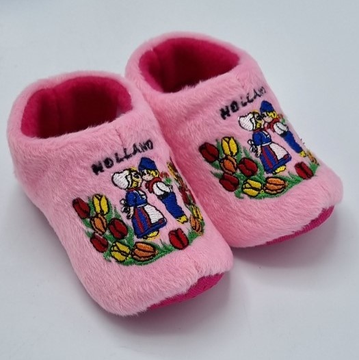 Keep baby feet wonderfully warm with these soft pink clog booties from Typisch Hollands. Decorated with a cute Delft blue kissing couple. Ultralight filling and a perfect fit for babies aged 0-6 months. The ideal Dutch maternity gift for girls!