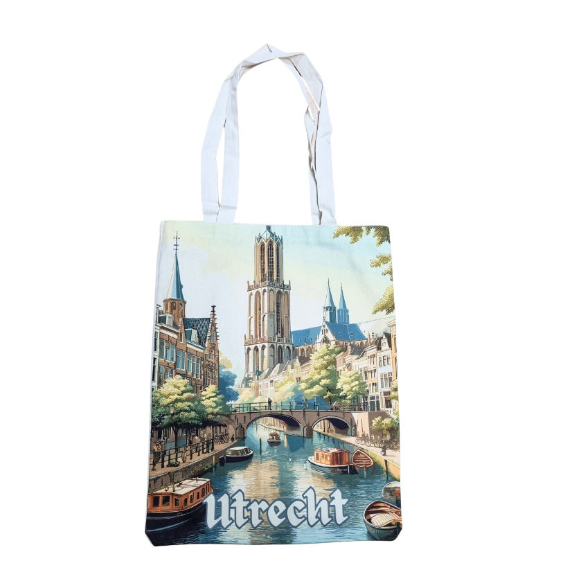 Cotton tote bag with long handles. Are you looking for a nice and practical Dutch gift? This could be a good idea. Cotton bag Utrecht - Full color. A cotton carrier bag, so say goodbye to plastic!