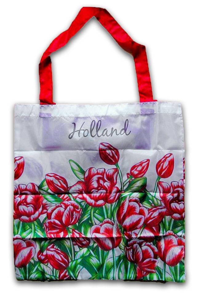 Nylon bag in storage pouch Handy Nylon Pouches Foldable - Reusable Shopping Bag. Printed with red tulip-floral pattern Includes pouch with zipper and hanging eye. Light weight Long carrying loops Size: 43 x 43 cm Dimensions pouch: 11 x 12 cm • Includes po