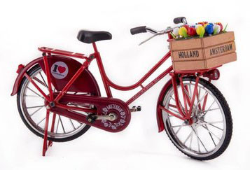 Fiets Rood - Holland An eye-catcher in every interior. What a nice scale model of this Red omafiets Complete with crate on the steering wheel - filled with tulips Every detail has been thought - self dress protectors with matching sticker • is delivered i