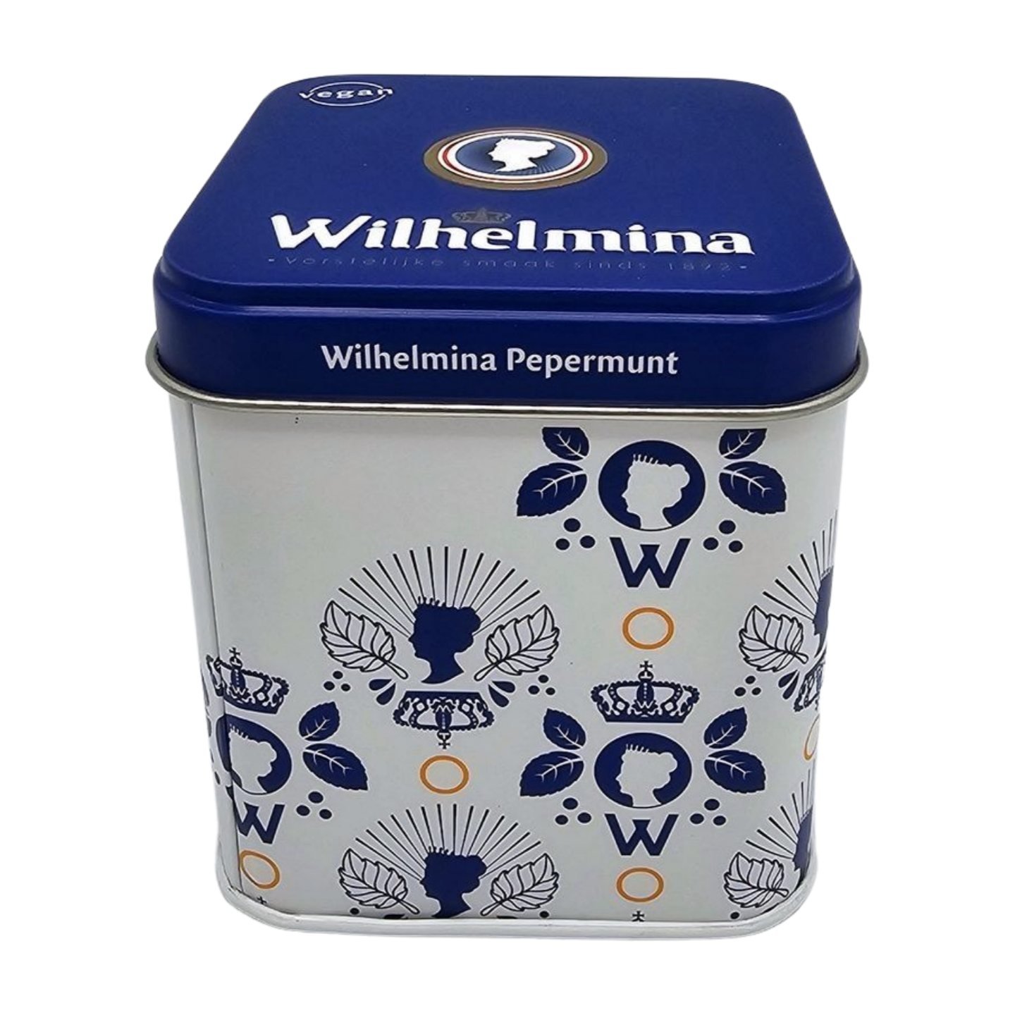 Tin of Peppermint - (Wilhelmina) with a Delft blue appearance. An elegant storage tin filled with refreshing (Wilhelmina) peppermint. This tin is one of a series of three. Contents: 100 grams Dimensions: 8x7x7 cm The tin has a loose lid with relief.