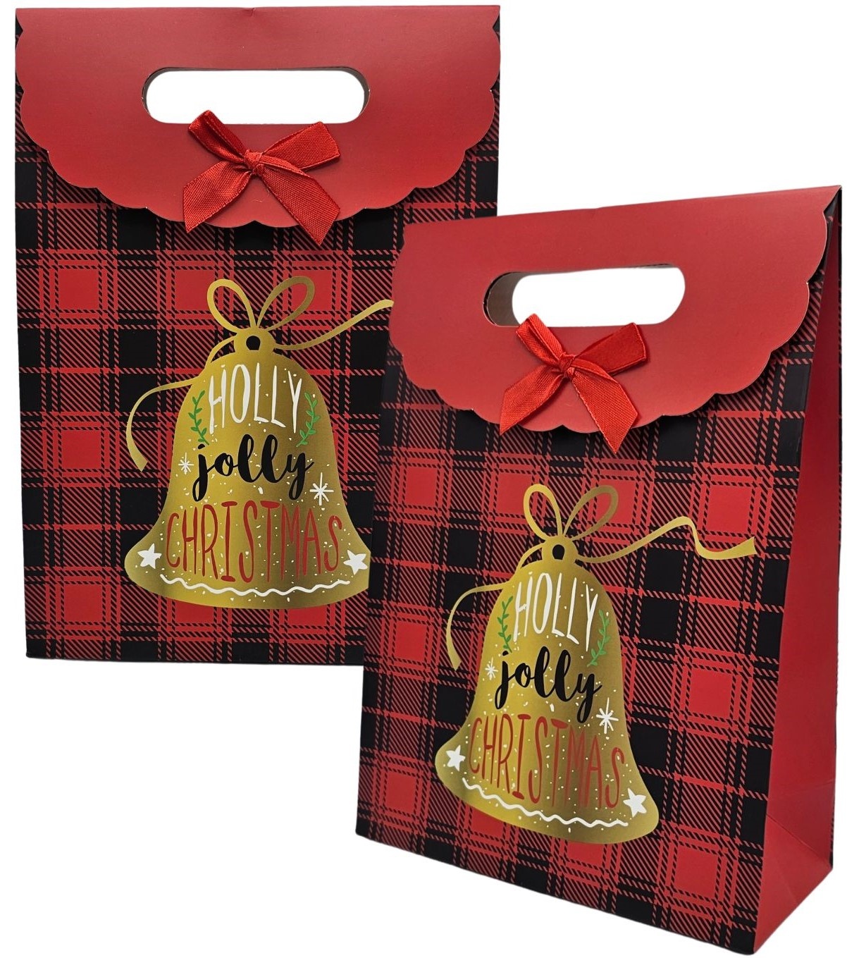 Cardboard Gift Bag - Christmas - Red with Gold Christmas Bell This Christmas gift bag is printed on all sides with stylish yet traditional prints. Available in four variations and two colourways: red and green.