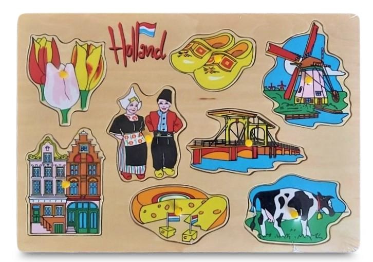 Windmill, gabled houses, clogs, windmill, traditional costume, skinny bridge, cow, and cheese