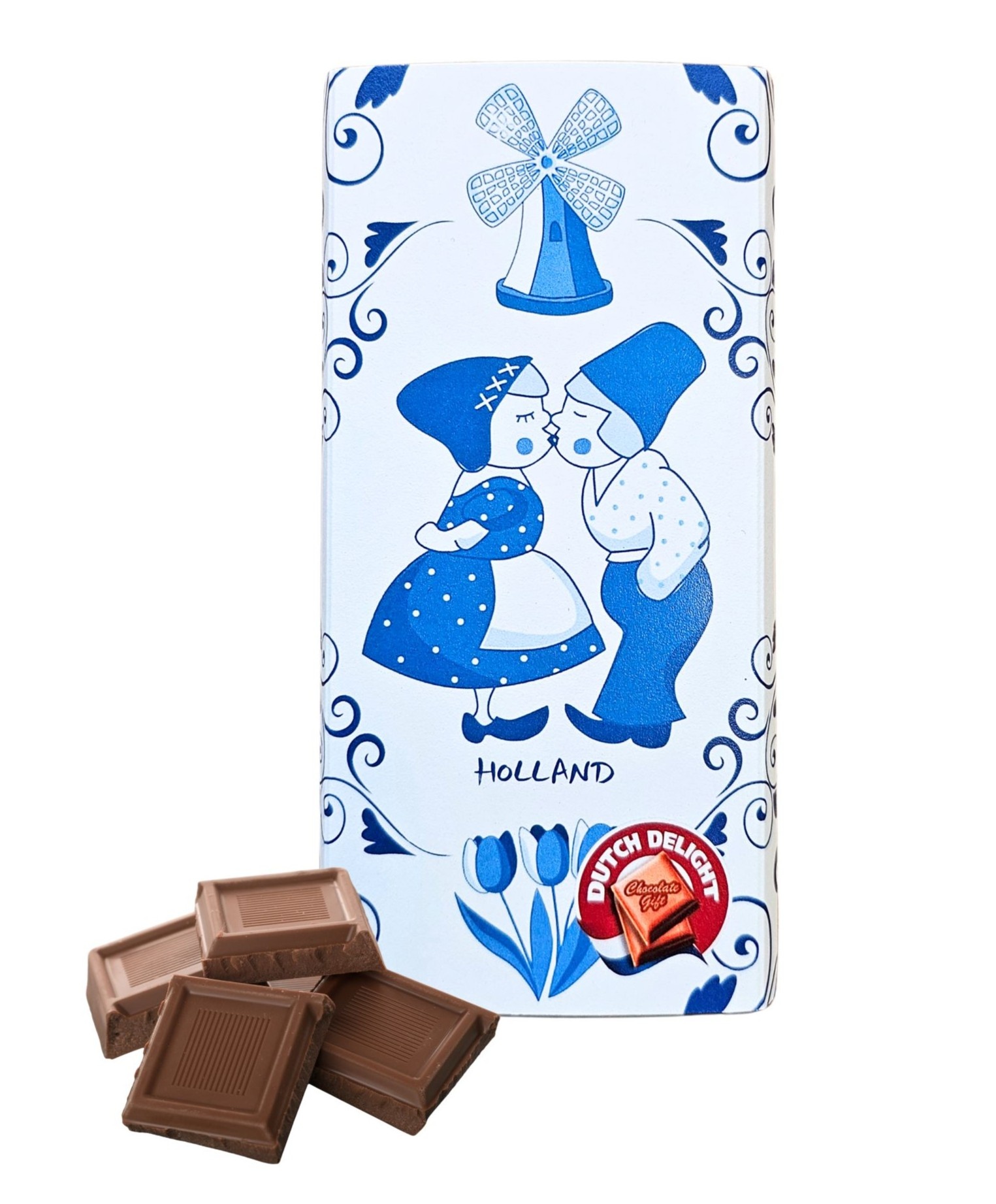 Milk chocolate bar in Delft blue gift packaging. Deliciously sweet 100-gram milk chocolate bar. The packaging alone is enough to make you want to buy this bar. Print: Kissing Couple, Holland