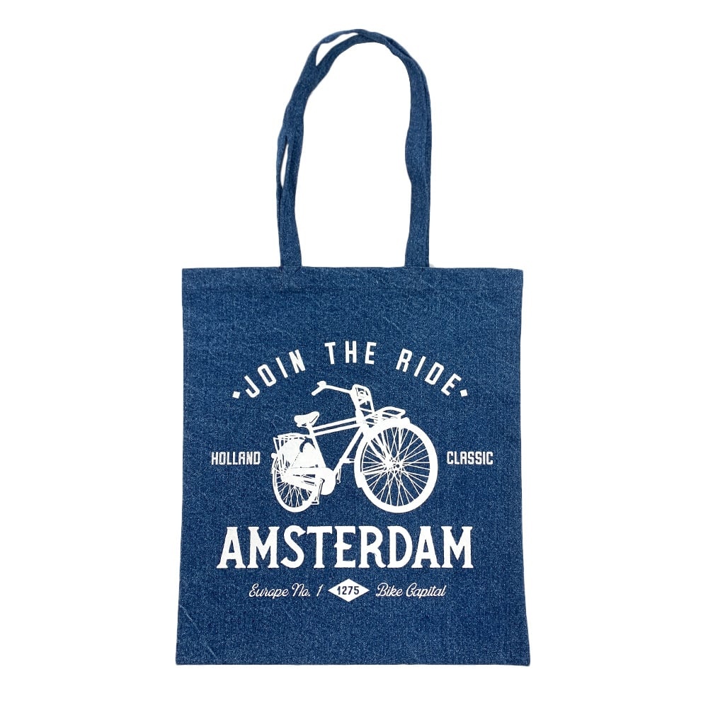 Bag Denim cotton blue bicycle - join the ride Are you looking for a nice and practical Dutch gift? That might be a nice idea. A denim tote bag - so get rid of that plastic.
