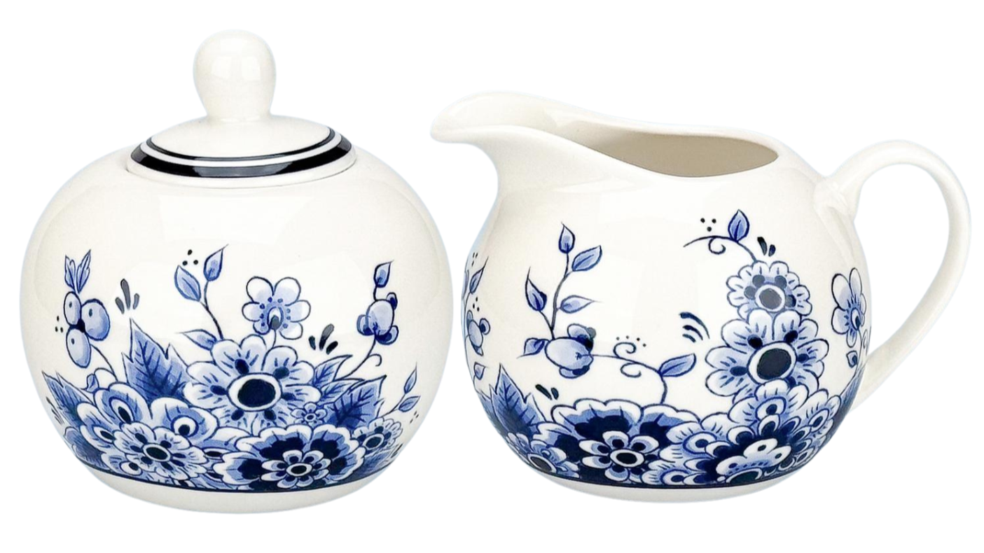 A stylish Delft blue cream set consisting of a sugar bowl and a milk jug.