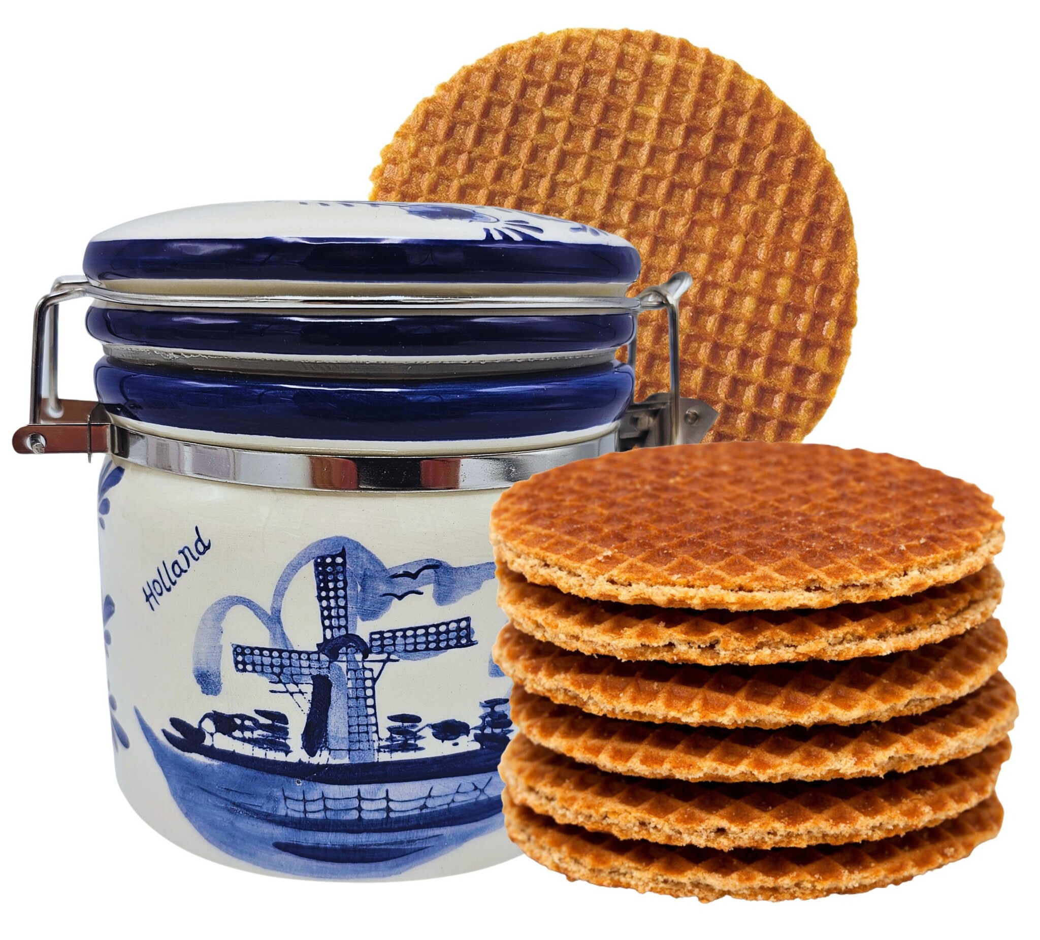 Delft blue storage jar - with syrup waffles. Dimensions: 12 cm. Packaged in a sturdy gift box.