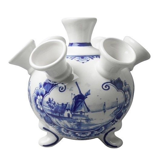 This Delft blue tulip vase is decorated with a Dutch windmill landscape.