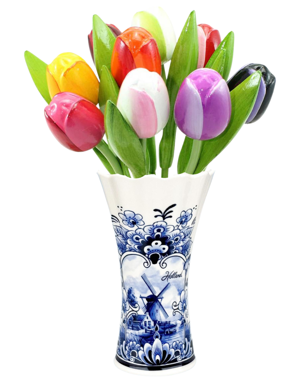 Delft blue vase with 9 wooden tulips - mixed colors