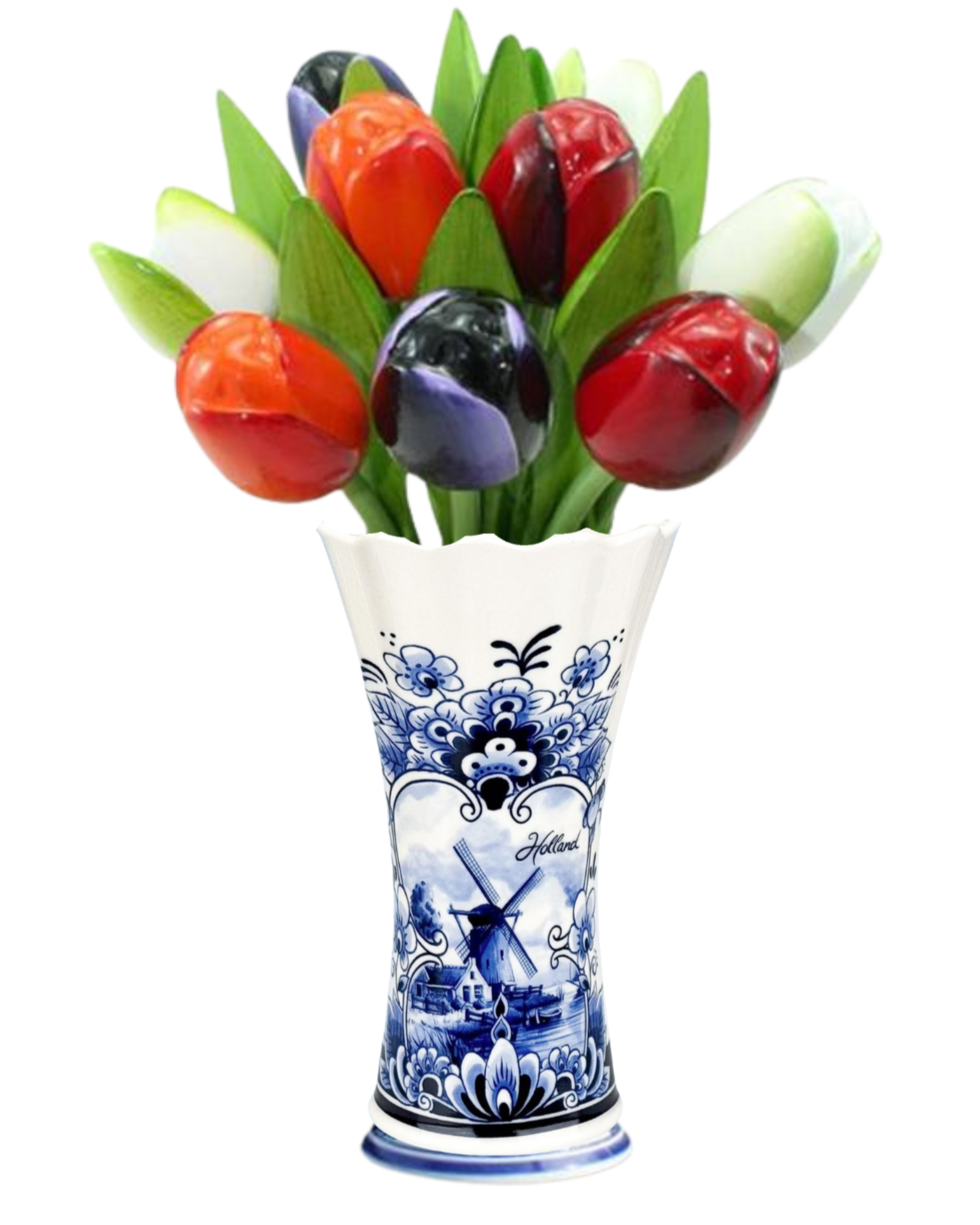 Delft blue vase with 9 wooden tulips - Red-White-Aubergine and Orange