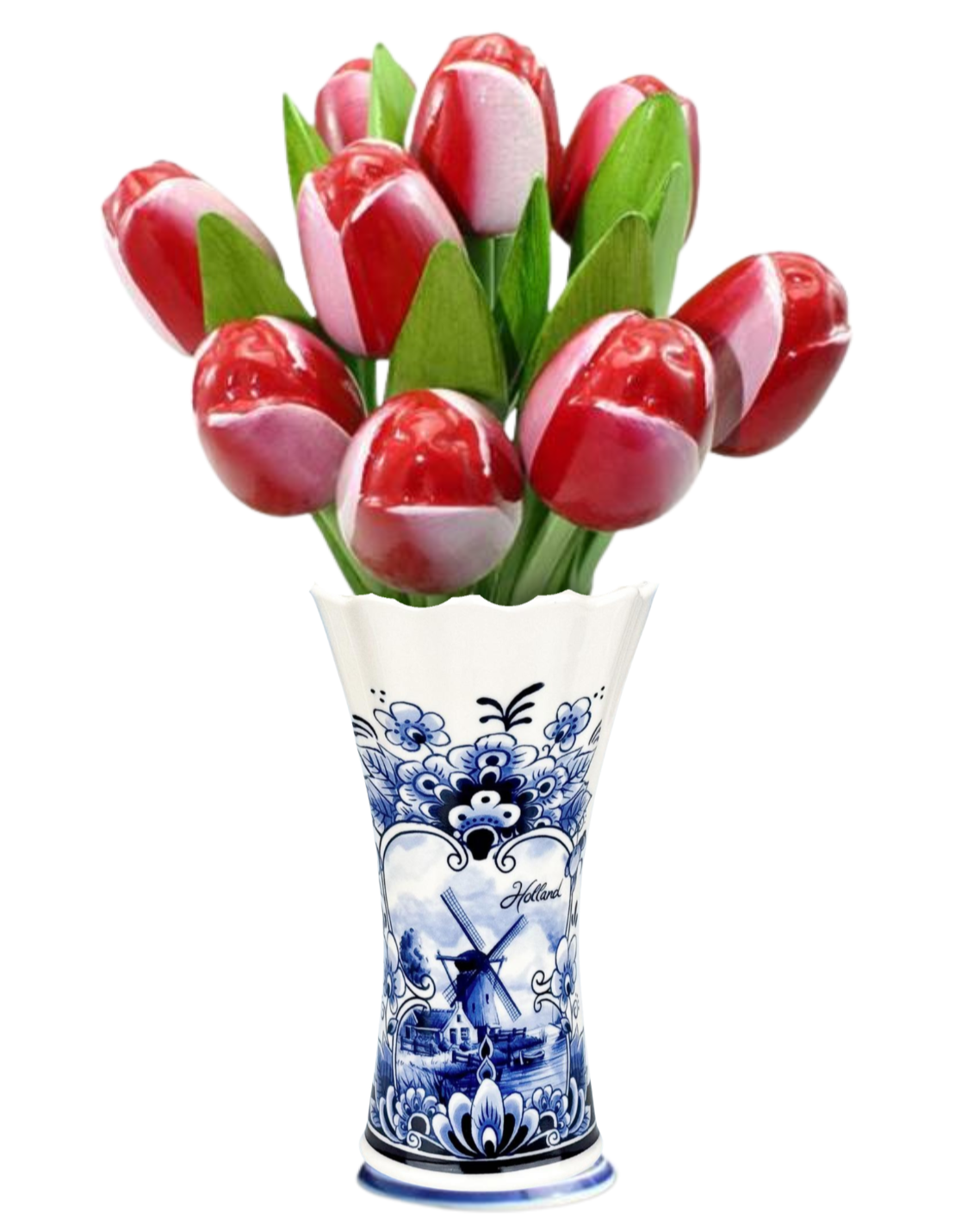 • Typisch Hollands Delft blue vase with 9 wooden tulips - Red-White