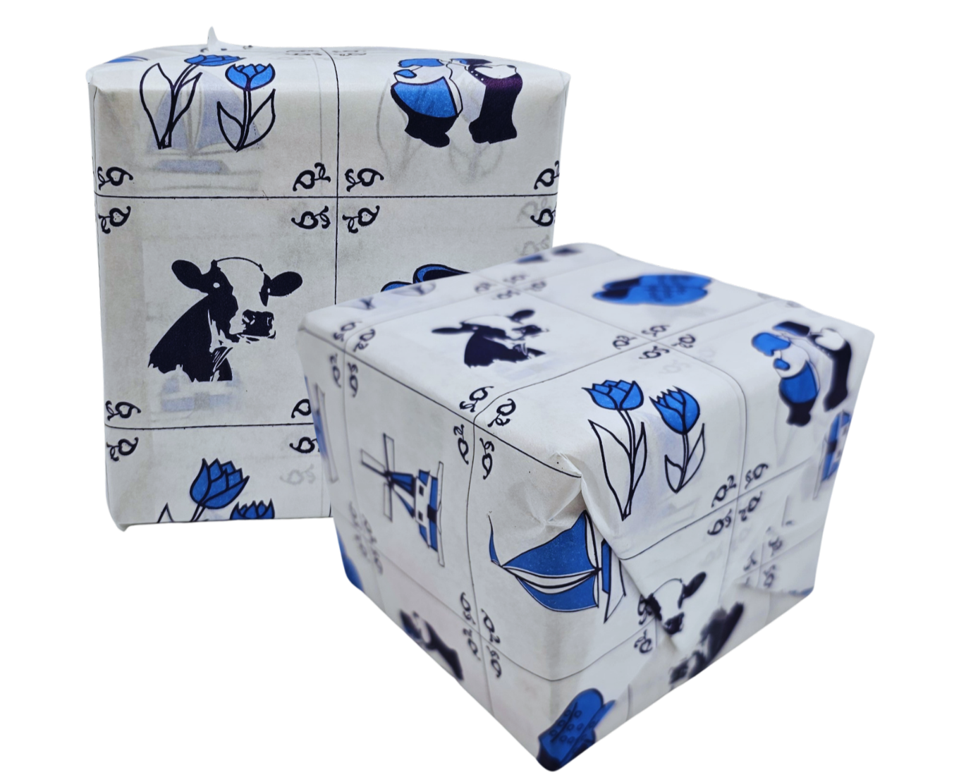 The paper is printed with a modern Delft blue tile motif with various typical Dutch icons.
