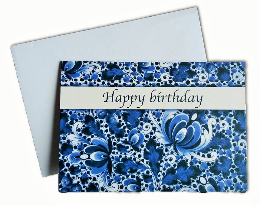 Double greeting card - Happy Birthday - Delft blue Double greeting card made of extra sturdy cardboard, Tulips-Cheese -windmills and Wooden shoes Equipped with an envelope. Dimensions: 12 x 17 cm •If you wish, we can write this card for you and package it