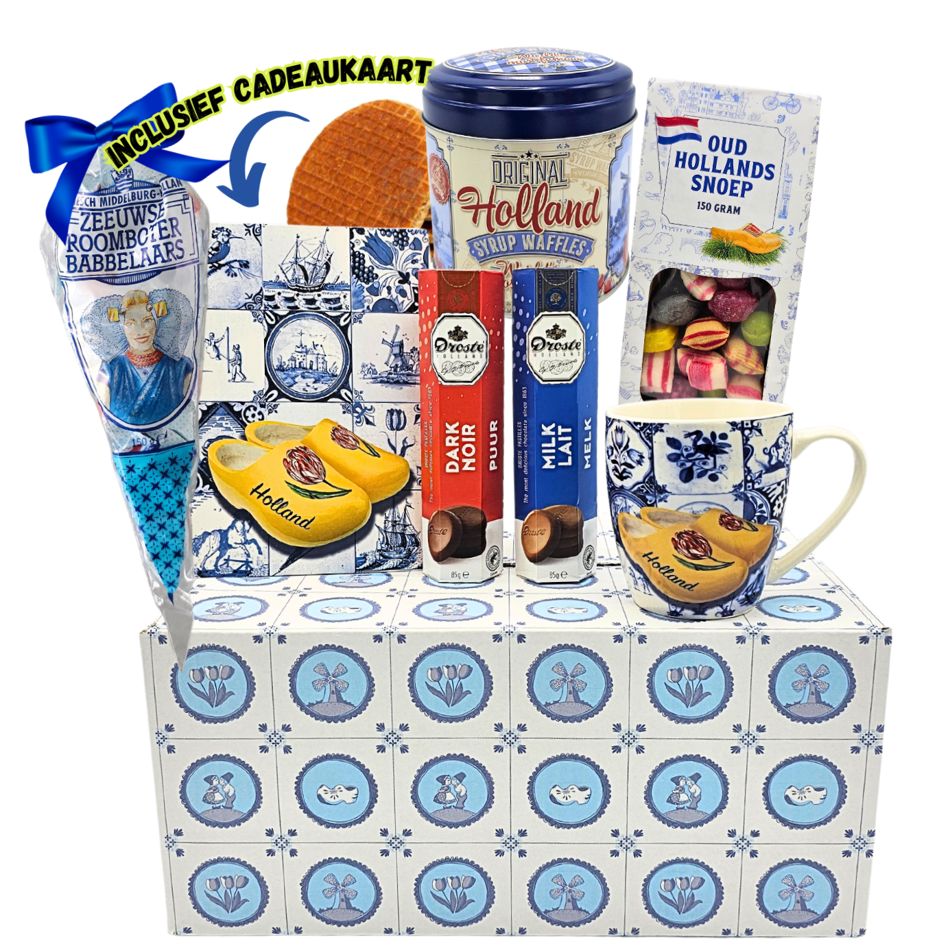 Dutch Sweets Package - Delft Blue Box Gift and sweets box (with a fun Dutch print) With a fun storage tin and a beautiful Holland mug.