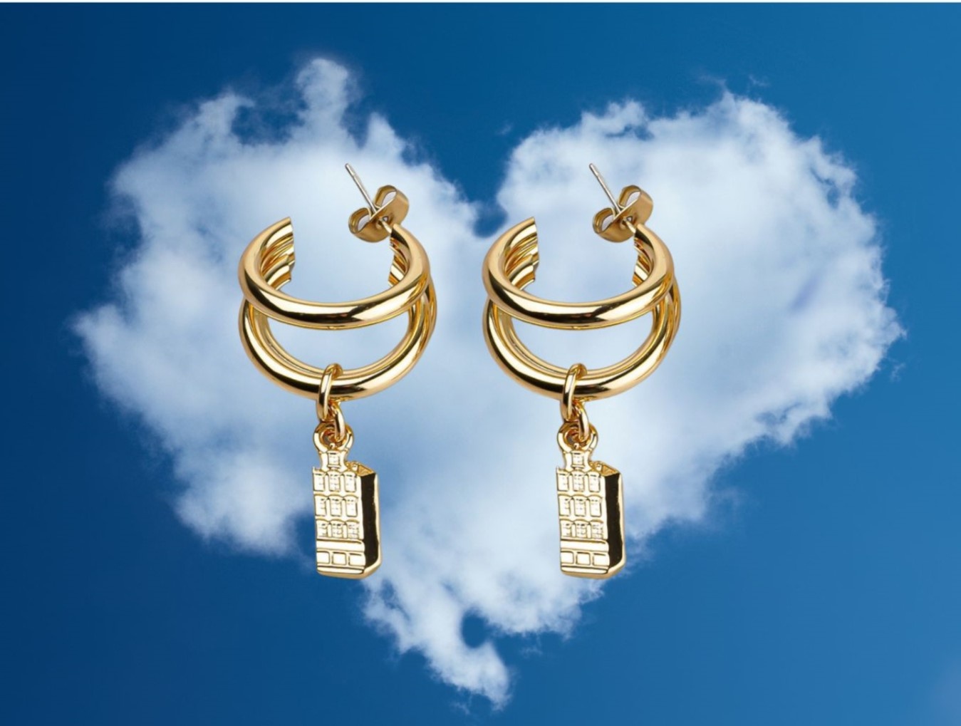 Stylish double hoop earrings with a gold-colored finish and an iconic charm in the shape of an Amsterdam gable house. These nickel-free stud earrings are 4 cm long and combine modern elegance with a typical Dutch character.