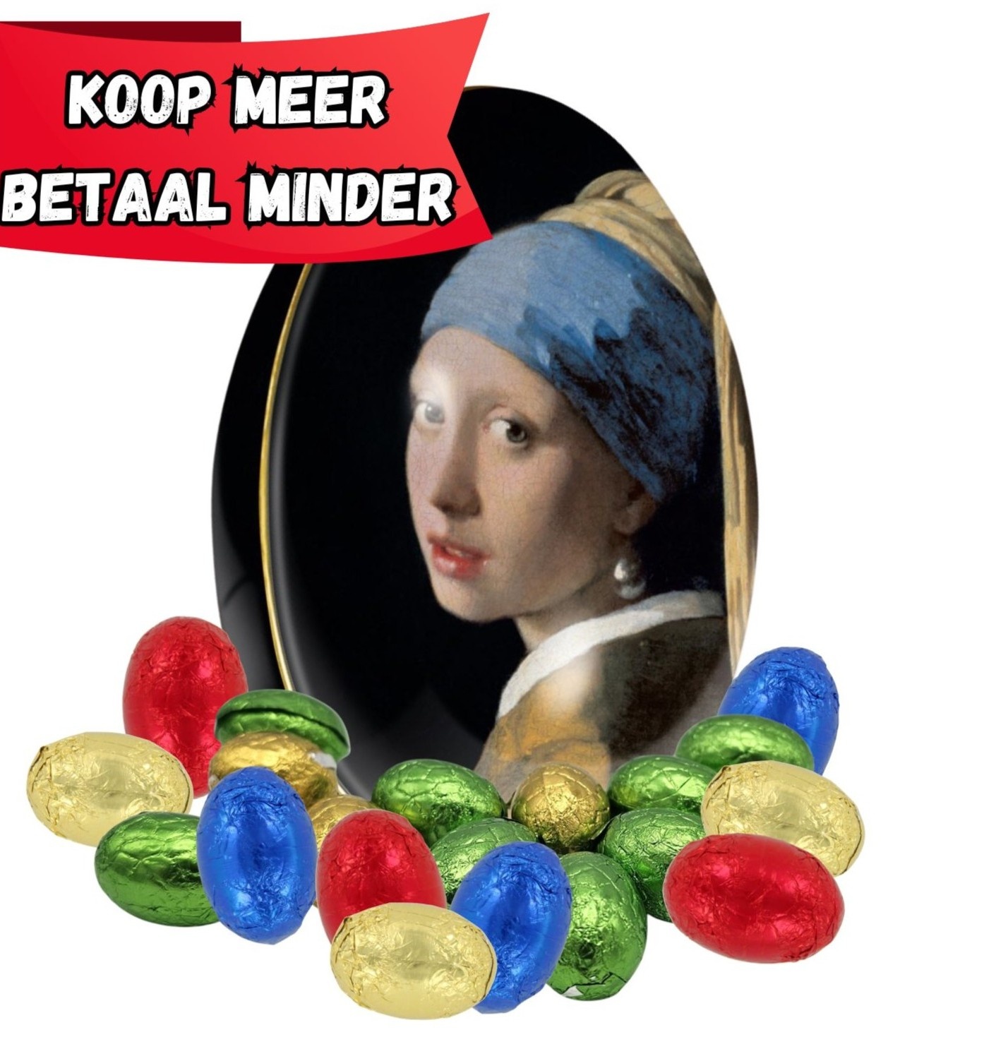 Easter egg-shaped gift tin. Easter egg (tin) filled with chocolate eggs - the girl with the pearl. Filled with a mix of chocolate eggs, this is a very welcome surprise during Easter.
