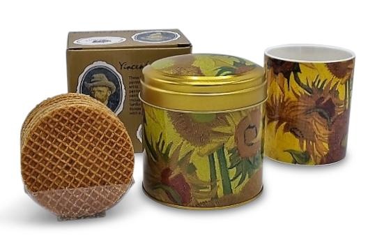 Stroopwafels in a tin with matching mug.Packed together in a vacuum seal to form a compact gift