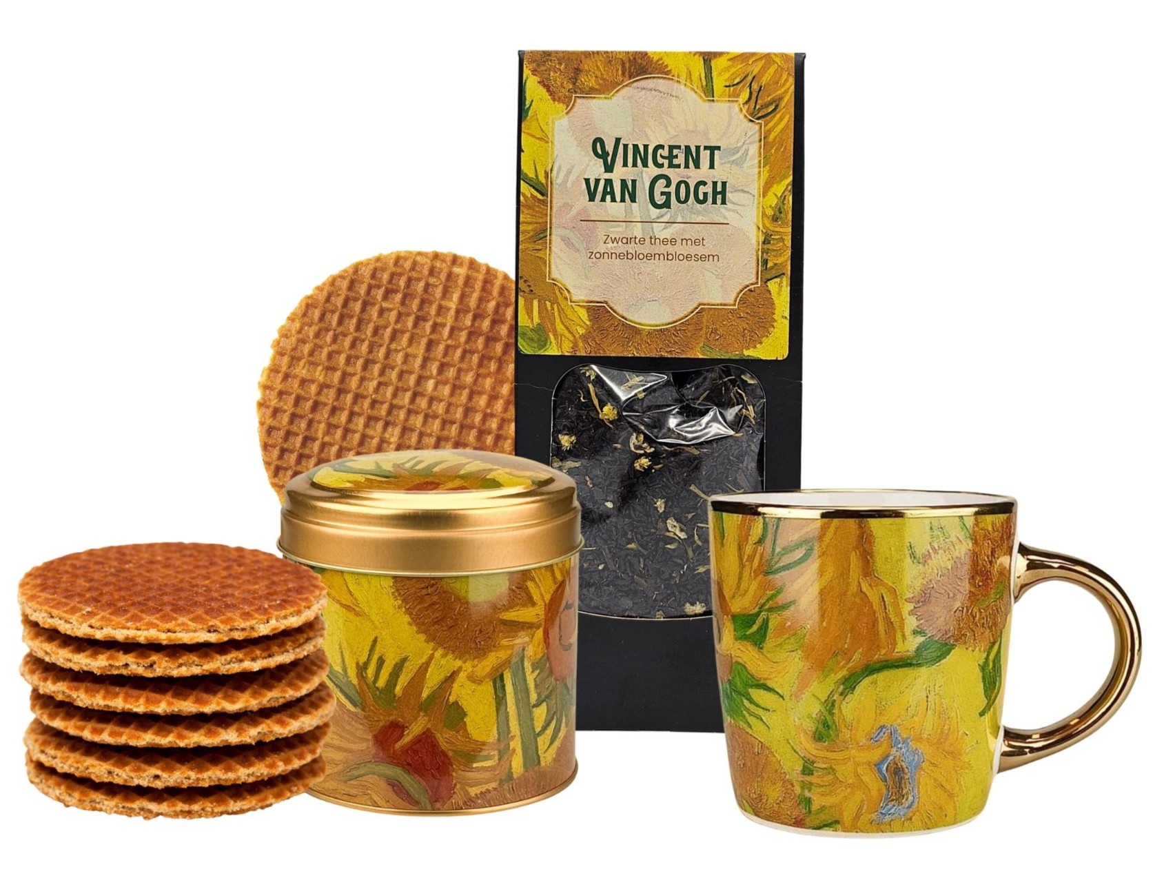 Stroopwafels in a Can : Enjoy the authentic taste of the Netherlands with stroopwafels made with butter. These delicious treats are packaged in a stylish tin decorated with Vincent van Gogh's iconic Sunflowers painting. The tin contains 8 stroopwafels, perfect for tea.