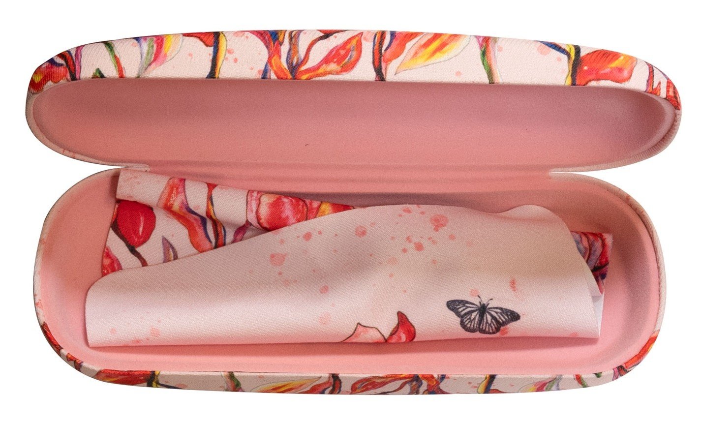 The glasses case has a luxurious appearance thanks to the soft interior and the glasses cloth made of a satin-like fabric with the Sunblush print.