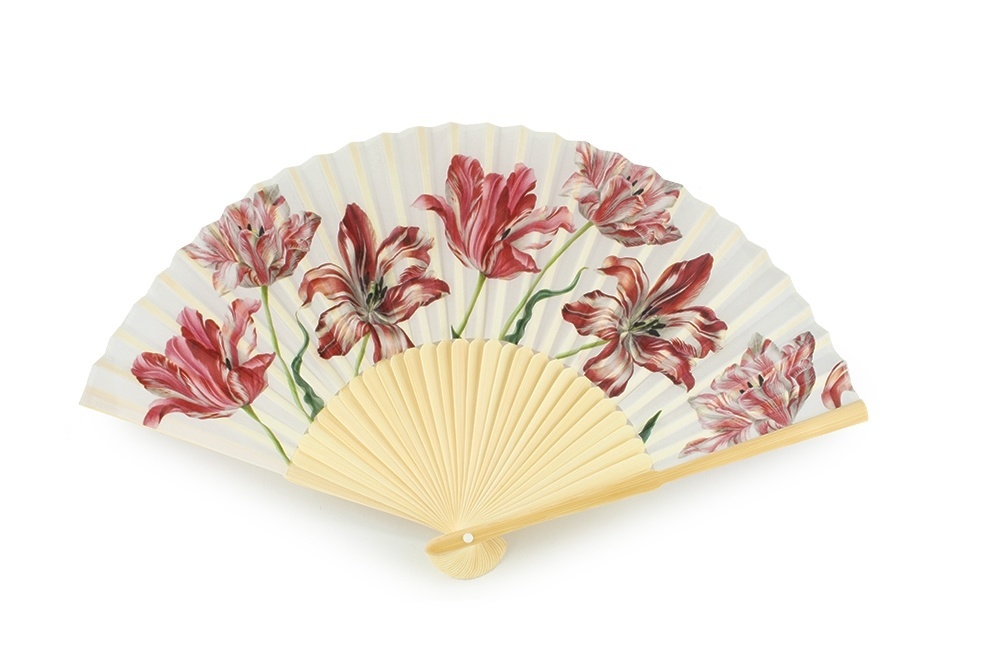 Stylish handheld fan with printed fabric.