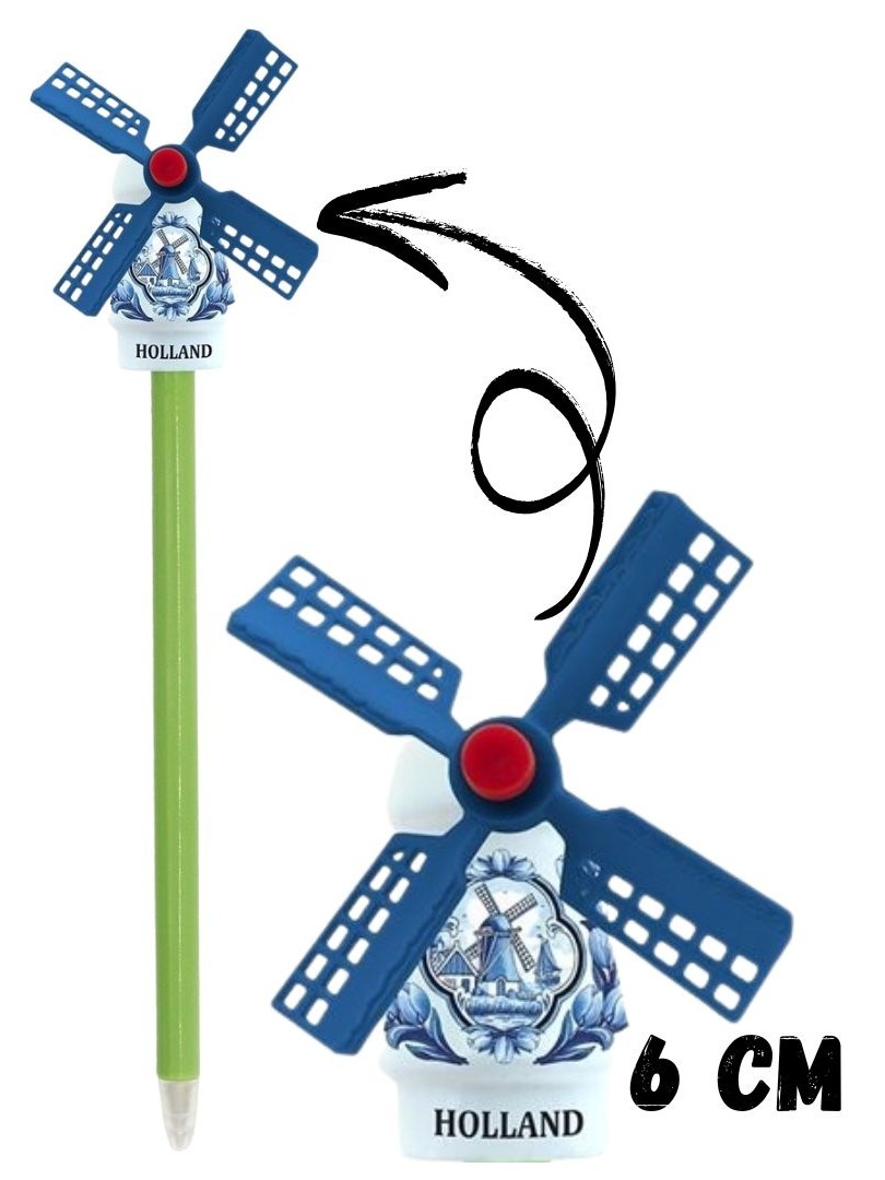 This Delft blue ballpoint pen has a windmill on top and is 16 cm long.