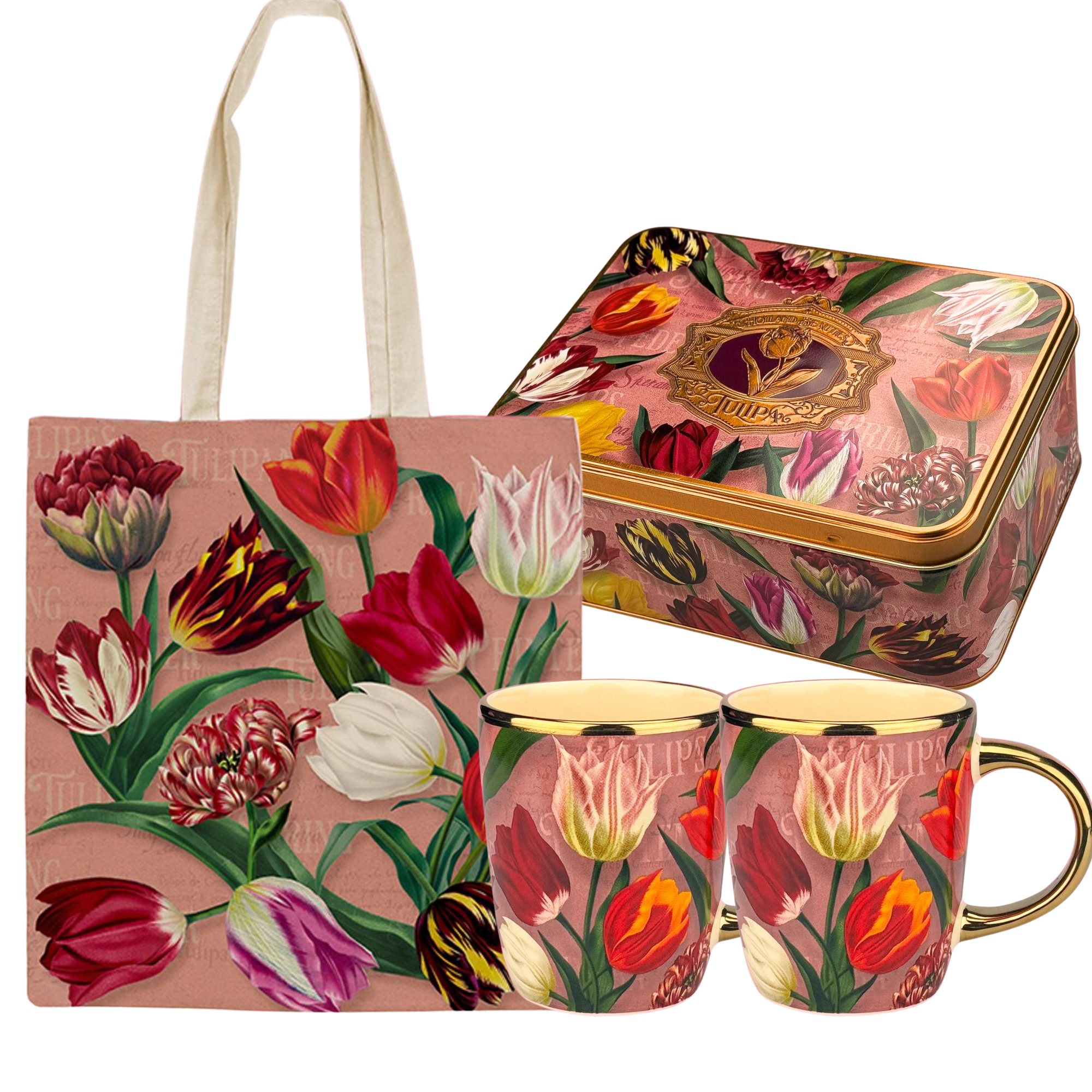 Stylish tulip decoration on mugs, cans and even on the carrier bag